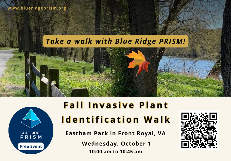 Join Natali Walker, Invasive Management Specialist at Blue Ridge PRISM, and Eastham Park in Front Royal. for this FREE field training where you’ll learn how to identify invasive plants in the fall. This session includes a short hike along trails, some with uneven surfaces.